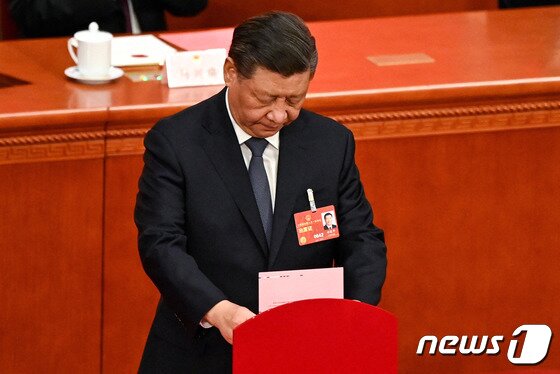 | 시진핑 중국 국가 주석이 11일 (현지시간) 베이징 인민대회당에서 열린 전인대서 국무원 총리를 선출하는 투표를 하고 있다. © AFP=뉴스1 © News1 우동명 기자 |