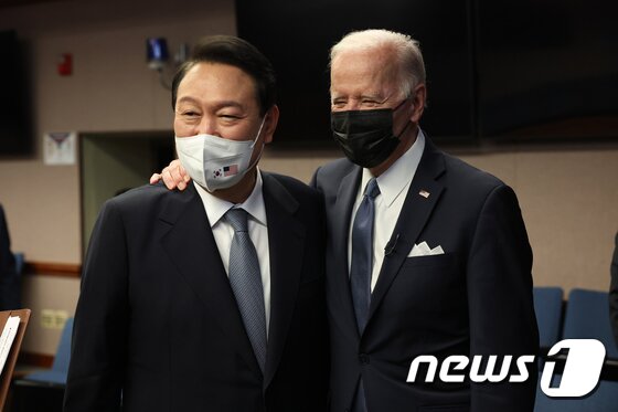 윤석열 대통령과 조 바이든 미국 대통령이 지난해 5월22일 오전 경기도 평택 오산공군작전사령부 항공우주작전본부(KAOC·Korean Air And Space Operations Center)를 방문해 친근하게 대화를 나누고 있는 모습. (대통령실사진기자단) 2022.5.22/뉴스1 © News1 안은나 기자 |