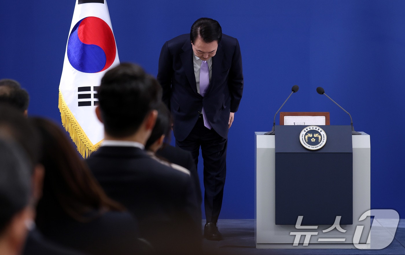 윤석열 대통령이 7일 서울 용산 대통령실 청사 브리핑실에서 대국민 담화 중 국민들에게 고개숙여 사과하고 있다. 2024.11.7/뉴스1 ⓒ News1 박지혜 기자