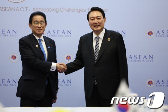윤석열 대통령이 지난해 11월 13일(현지시간) 캄보디아 프놈펜의 한 호텔에서 열린 한일 정상회담에서 기시다 후미오 일본 총리와 악수하고 있다. (대통령실 제공) 2022.11.14/뉴스1 © News1 오대일 기자 |