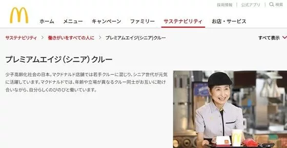 맥도날드 재팬은 채용 사이트에 ‘서스테이너빌리티(지속 가능성’ 카테고리를 통해 학생·주부·프리미엄 에이지(시니어)·외국인·챌린지(장애인) 크루를 위한 채용 소개란을 따로 만들어 두었다. 각종 포스터에도 시니어 크루가 섞여 있는 모습을 쉽게 발견할 수 있다.
