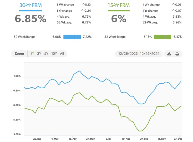미국의 주택담보대출(모기지) 금리가 연말을 맞아 다시 상승하며 연초 수준인 6.85%로 돌아간 것으로 나타났다.