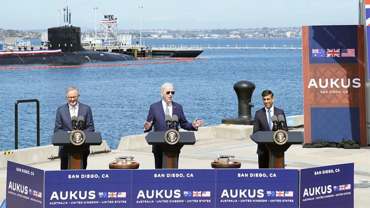 2023년 3워러 13일 (좌로부터) 앤서니 앨버니지 호주 총리, 조 바이든 대통령, 리시 수낵 영국 총리가 캘리포니아주 샌디에이고 포인트 로마 해군기지에서 기자회견을 갖고 있다.