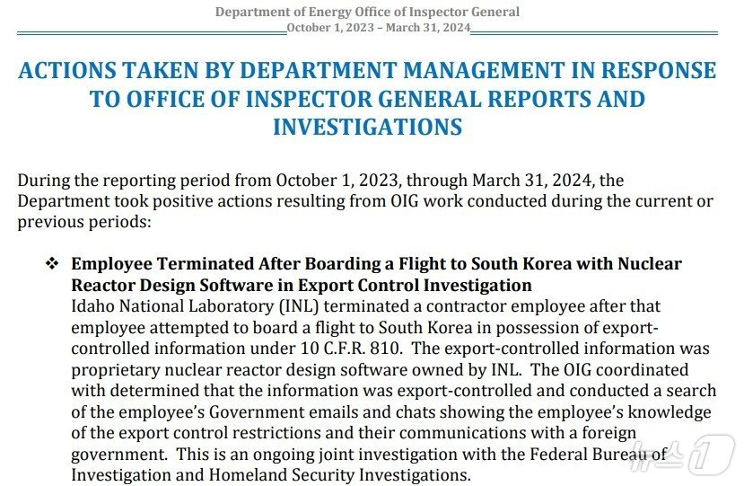 17일(현지시간) 에너지부 감사관실이 미국 의회에 제출한 반기보고서에 따르면, 아이다호 국립연구소(INL)의 도급업체 직원이 수출통제 대상에 해당하는 정보를 소지한 채 한국으로 향하는 항공기에 탑승하려다 적발돼 해고된 사건이 발생했다.