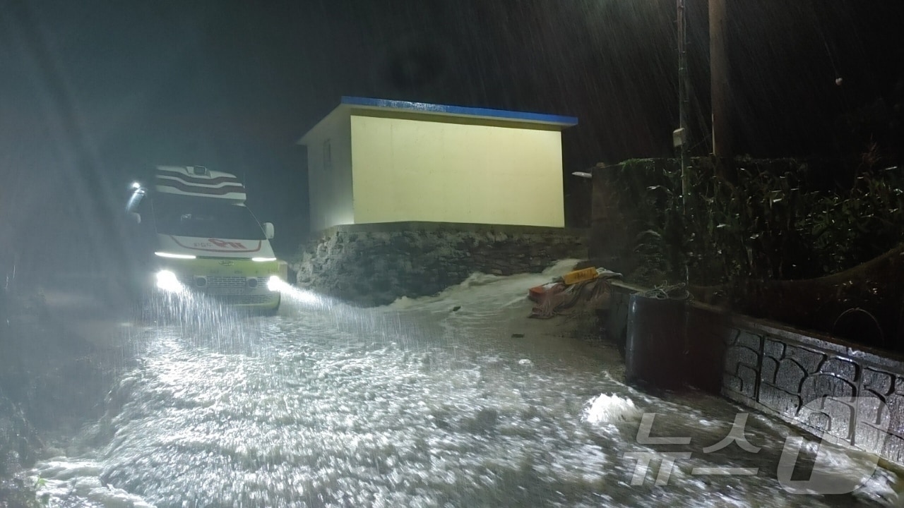 16일 오전 0시 21분쯤 전남 신안군 흑산면 한 경사로에 폭우로 빗물이 쏟아져 내려오고 있다. (신안소방 제공) 2024.7.16/뉴스1 ⓒ News1 이승현 기자