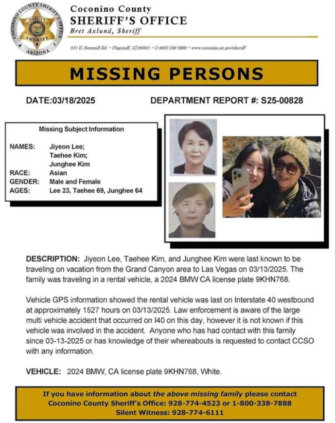 코코니노 카운티 보안관 사무소는 현재 실종된 세 가족의 행방을 찾고 있다고 밝혔다. 실종된 가족은 이지연(23), 김태희(69), 김정희(64) 씨다.