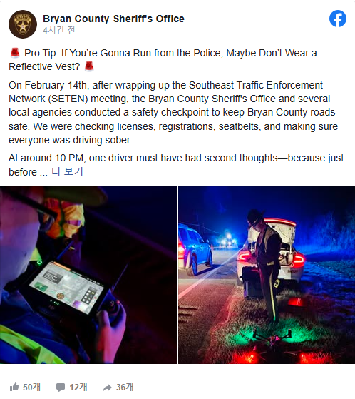 브라이언 카운티 보안관실은 “그리고 여기서 상황이 더 웃겨집니다… 용의자는 형광 노란색의 고반사 작업용 조끼를 입고 있었습니다. 그래서 수색용 조명이 그를 비추자, 마치 크리스마스트리처럼 환하게 빛났습니다”라고 전했다.