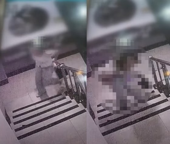 A 씨는 계단을 치우고 CCTV를 확인했는데, 한 여성이 계단을 오르다가 갑자기 주저앉아 소변을 보는 모습이 담겼다. 볼일을 해결한 여성은 계단에 내려뒀던 짐을 챙겨 재빠르게 사라졌다.