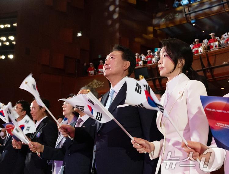 윤석열 대통령과 김건희 여사가 15일 서울 종로구 세종문화회관에서 열린 제79주년 광복절 경축식에서 태극기를 흔들고 있다. (대통령실 제공) 2024.8.15/뉴스1 ⓒ News1 송원영 기자