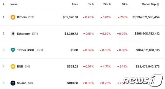 2일 오후 8시 20분 현재 비트코인은 글로벌 코인 시황 중계사이트인 코인마켓캡에서 24시간 전보다 5.61% 급락한 6만5826달러를 기록하고 있다. 6만6000달러가 붕괴한 것.