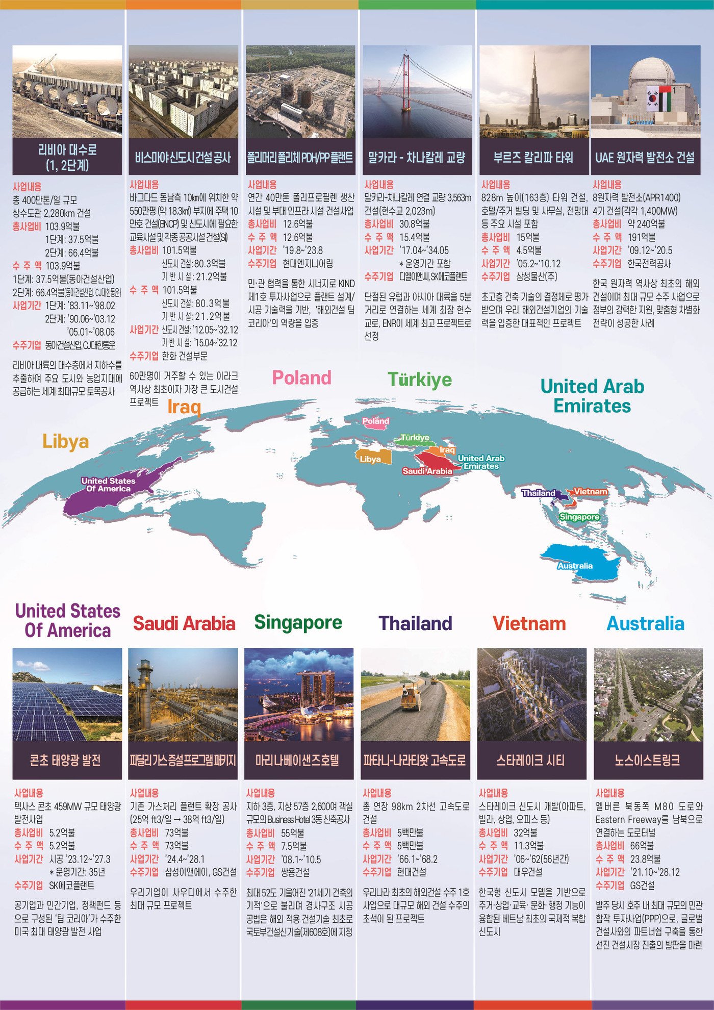 역대 수주실적 1위는 UAE 원자력 발전소(191억 3000만 달러, 2009년), 2위 이라크 비스마야 신도시(80억 3000만 달러, 2012년), 3위 사우디아라비아 파딜리 가스 증설 프로그램(73억 달러, 2024년), 4위 쿠웨이트 클린 퓨얼 프로젝트(72억 9000만 달러, 2014년), 5위 이라크 카르발라 정유공장 프로젝트(68억 4000만 달러, 2014년) 순이다.
