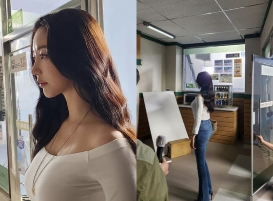 공개된 사진 속에는 한 편의점에서 광고 촬영을 하는 김사랑의 모습이 담겼다. 머리를 길게 늘어트린 그는 흰 티셔츠에 청바지 차림으로 청순하면서도 성숙한 매력을 드러냈다.