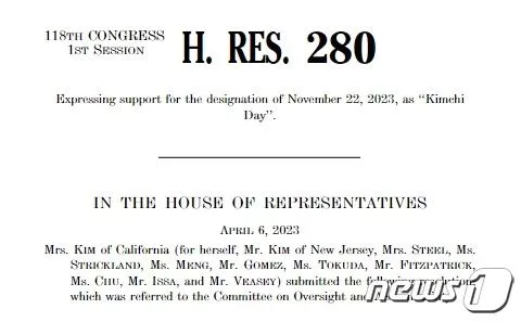 김치의 날을 미국 연방 차원에서 공식 기념일로 지정하자는 결의안은 지난해 처음 발의됐지만, 회기 만료로 폐기된 바 있다.