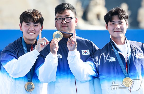 김우진(32·청주시청), 김제덕(20·예천군청), 이우석(27·코오롱)으로 이뤄진 한국은 30일(한국시간) 프랑스 파리 레쟁발리드에서 열린 2024 파리 올림픽 양궁 남자 단체전 결승에서 프랑스를 세트 점수 5-1로 꺾고 우승했다.