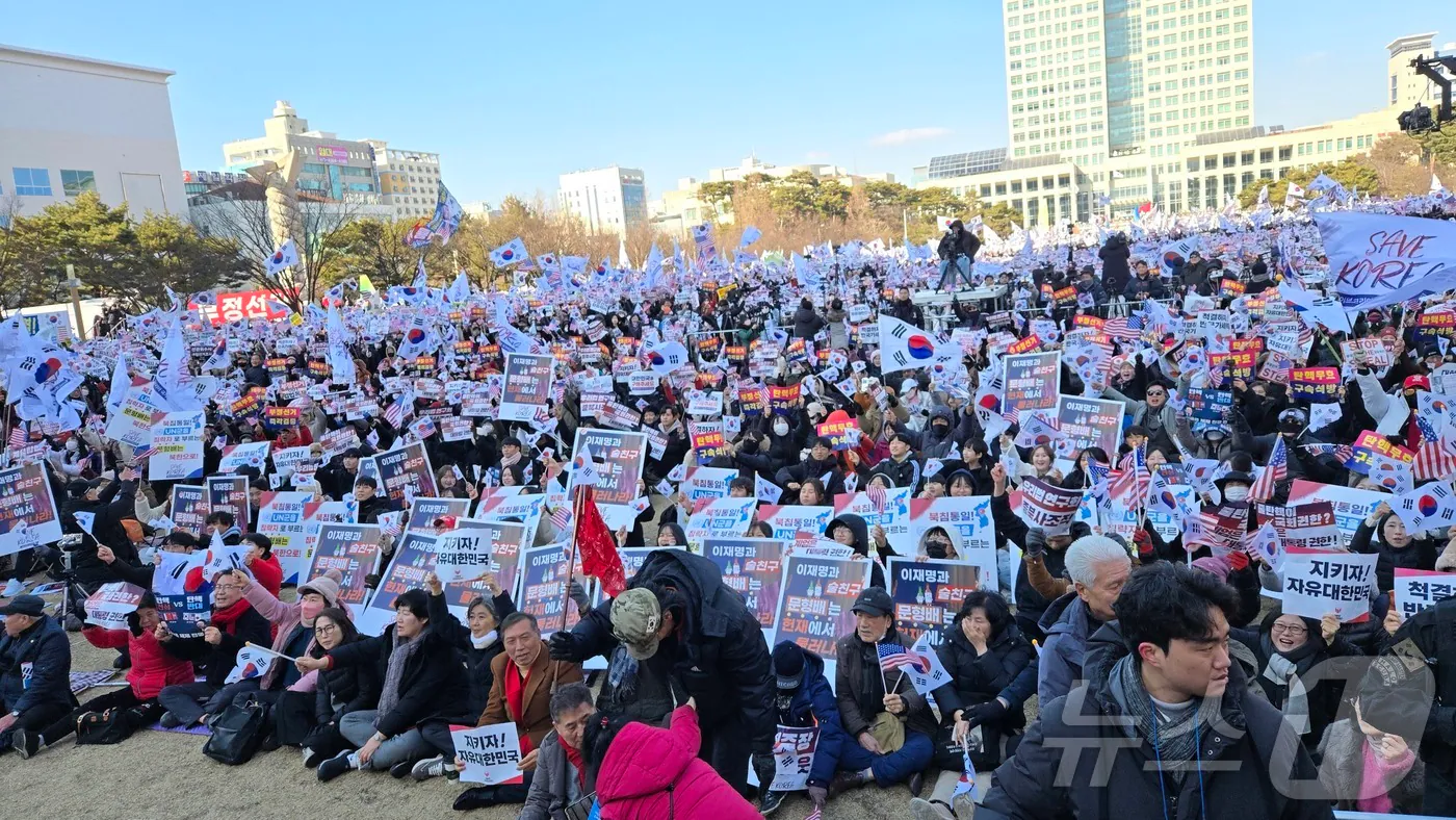 이날 오후 2시 대전 시청 남문 광장에서 개신교단체 ‘세이브코리아’ 주최로 열린 탄핵 반대 집회에는 주최 측 추산 2만 명, 경찰 추산 1만 7000여명이 모였다.