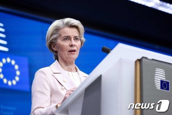 우르줄라 폰데어라이엔 EU 집행위원장이 9일(현지시간) 벨기에 브뤼셀의 EU 특별 정상회의서 기자회견을 하고 있다. © AFP=뉴스1 © News1 우동명 기자