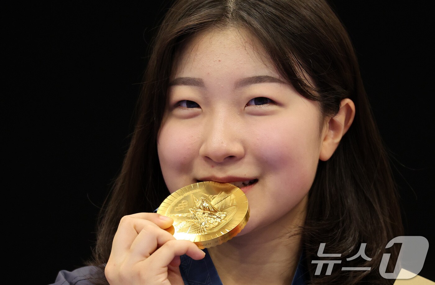 대한민국 사격 대표팀 반효진이 29일(한국시간) 프랑스 샤토루 슈팅 센터에서 열린 2024 파리올림픽 사격 공기소총 10m 여자 시상식에서 금메달을 깨물어보이고 있다. 2024.7.29/뉴스1 ⓒ News1 이동해 기자