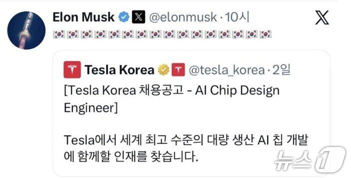 해당 공고는 ‘테슬라 AI’ 계정을 통해서도 공유됐다. 머스크는 이 게시물에 직접 댓글을 달아 한국 인재의 지원을 독려했다.