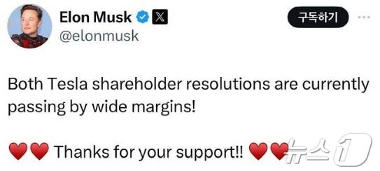 그는 X에 “테슬라의 두 가지 주요 안건이 압도적인 격차로 통과됐다”며 “여러분의 지지에 고마움을 표한다”는 글을 남겼다.