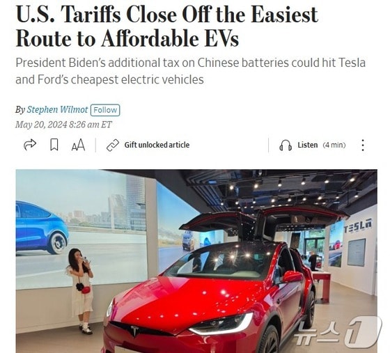 미국 언론인 월스트리트저널(WSJ)도 이날 미국의 전기차 관련 대중 관세 부과가 테슬라와 포드의 저렴한 전기차 생산에 큰 타격을 줄 것이라고 보도했다.