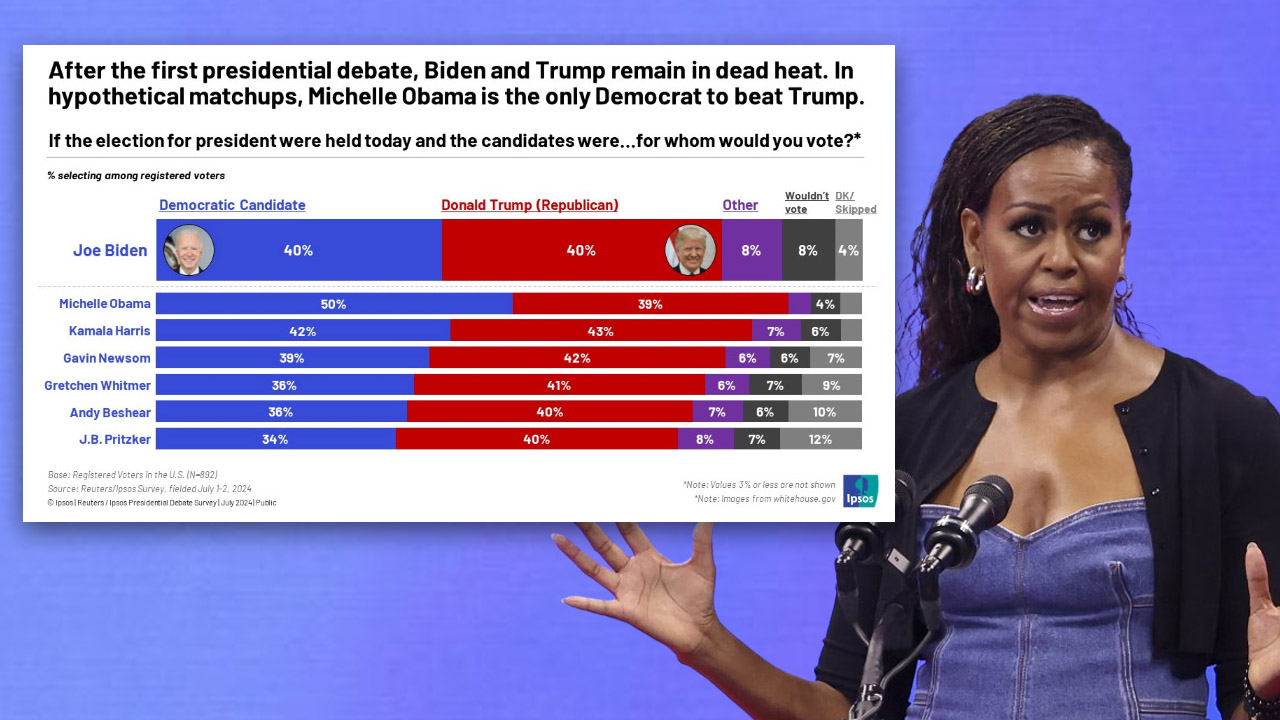 미셸 여사는 50%의 지지율로 트럼프 전 대통령(39%)을 가볍게 제쳤다. 바이든 대통령과 트럼프 전 대통령 간 대결에서는 두 사람 모두 40%를 받았다.