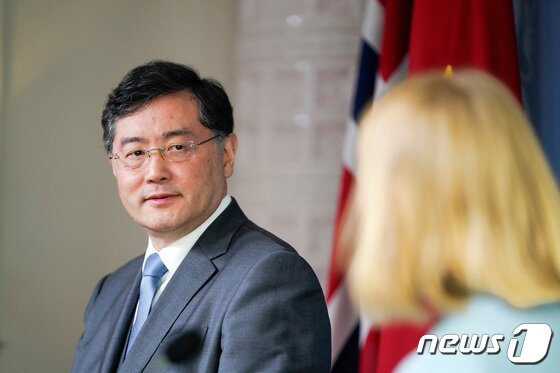 친강 중국 외교부장이 12일(현지시간) 노르웨이 오슬로에서 아니켄 후이트펠트 노르웨이 외교장관을 만나고 있다. 2023.05. © 로이터=뉴스1 © News1 김민수 기자 |