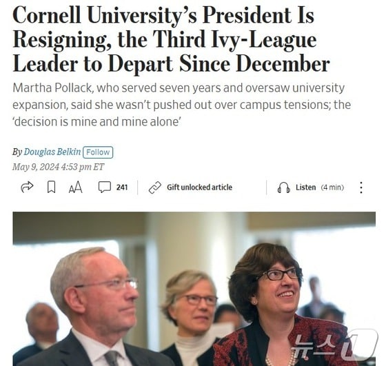 미국 대학가에서 반이스라엘 시위 논란이 지속되고 있는 가운데, 미사 폴락 코넬대 총장이 사임을 발표했다고 월스트리트저널(WSJ)이 9일(현지시간) 보도했다.