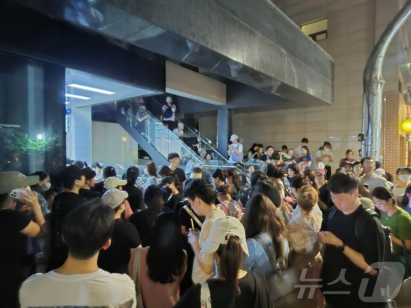 25일 오후 서울 강남구 티몬 신사옥 밖에서 정산·환불 지연 사태로 환불을 원하는 소비자들이 대기하고 있다. 2024.7.25/뉴스1 ⓒ News1 조유리 기자