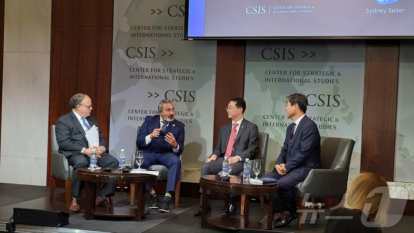 18일(현지시간) 미국 워싱턴DC에서 열린 한미전략포럼에 참석한 김영배 의원(우측부터) 김건 의원, 아미 베리 미 하원 의원, 시드니 사일러 전 미 국가정보위원회(NIC) 북한담당관이 공개간담회에서 이야기를 나누고 있다.
