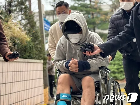 지난해 12월 9일 여성의 집에 몰래 들어가 성폭행을 시도하다 미수에 그친 혐의를 받는 30대 남성이 구속 전 피의자심문(영장실질심사)을 받기 위해 휠체어를 타고 인천지방법원에 출석하고 있다.2023.12.11/뉴스1 © News1 박소영 기자