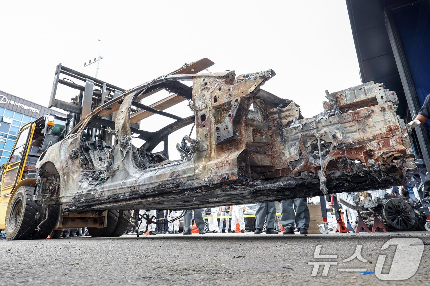 8일 오전 인천 서구의 한 정비소에서 지난 1일 청라 아파트 지하주차장에서 발생한 화재로 전소된 전기차가 2차 합동감식을 받기 위해 지게차에 실려 정비소 내부로 향하고 있다. 2024.8.8/뉴스1 ⓒ News1 민경석 기자