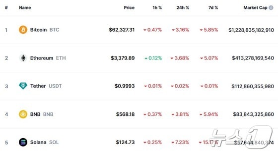 24일 오후 3시 30분 현재 글로벌 코인 시황 중계사이트인 코인마켓캡에서 비트코인은 24시간 전보다 3.16% 급락한 6만2327달러를 기록하고 있다.