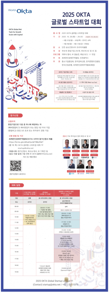 오는 10월 28~29일 인천 송도 컨벤시아 프리미어볼룸에서 열리는 2025 OKTA 글로벌 스타트업 대회는 세계한인경제무역협회와 인천광역시가 공동 주최하는 글로벌 창업 축제다.