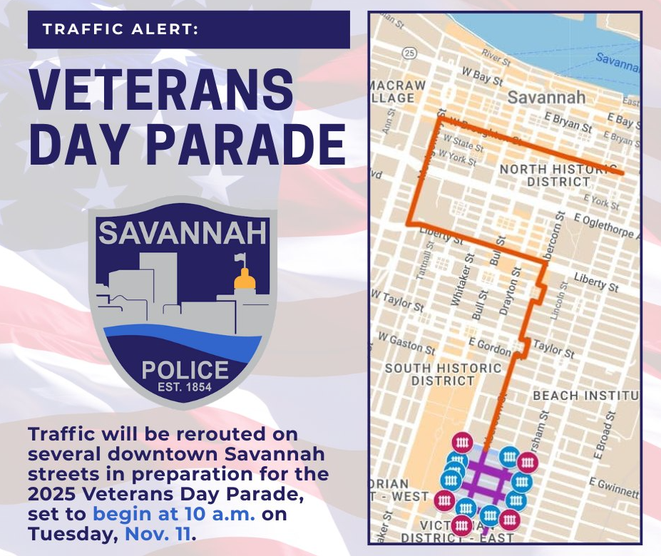 WJCL 22 뉴스의 보도에 의하면, 사바나시가 오는 11월 11일(화) 오전 10시, 다운타운 일대에서 베테랑스데이 퍼레이드(Veterans Day Parade) 를 개최함에 따라 다수의 주요 도로가 일시적으로 폐쇄된다. 운전자들은 우회로를 사전에 계획해야 한다.