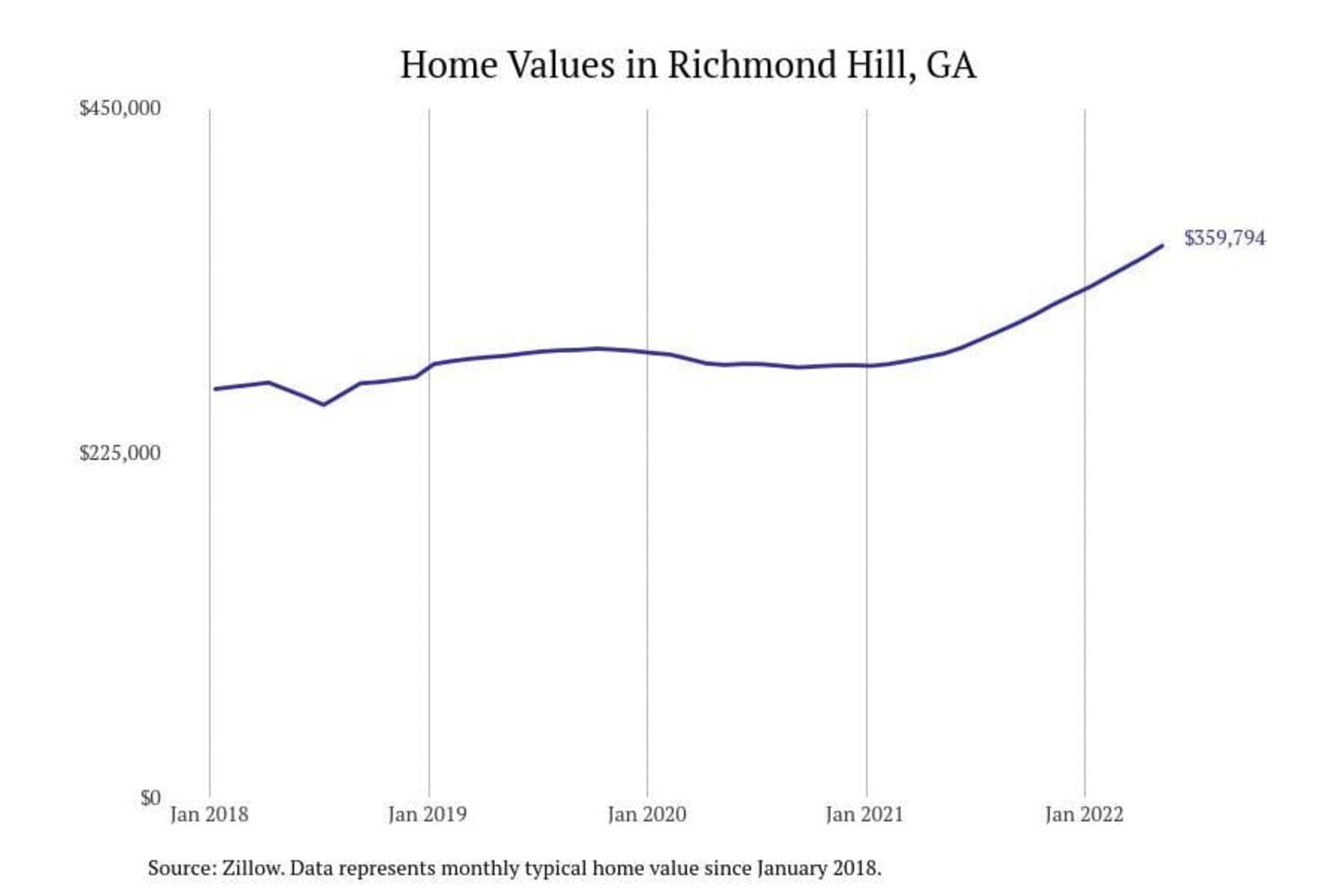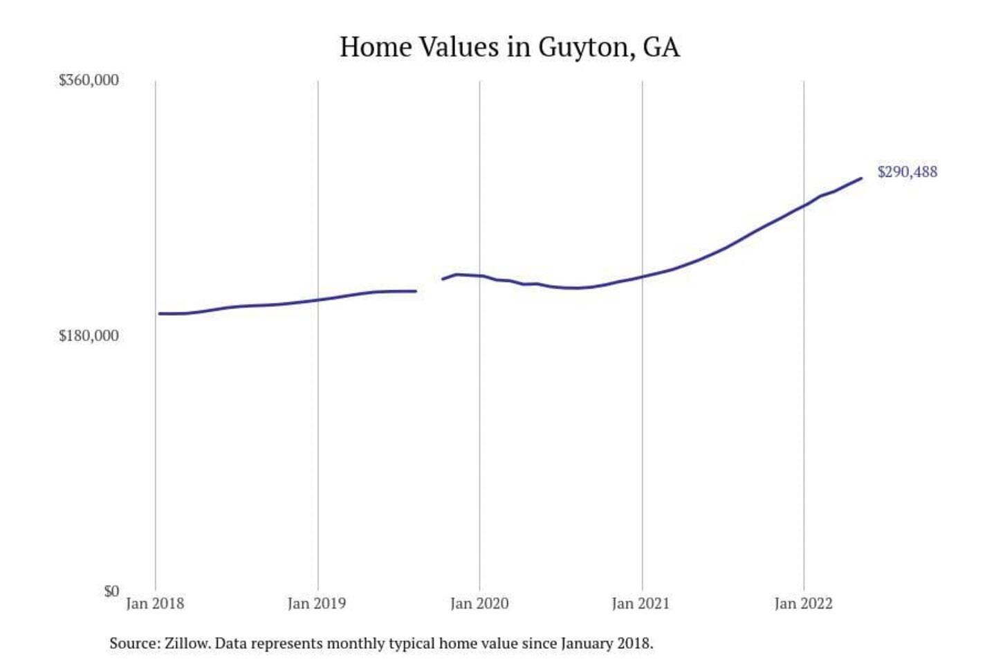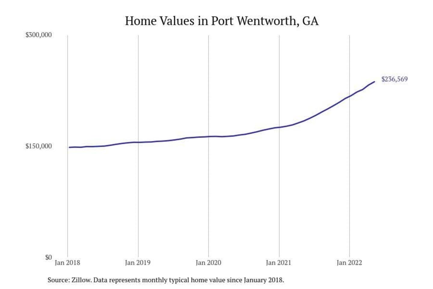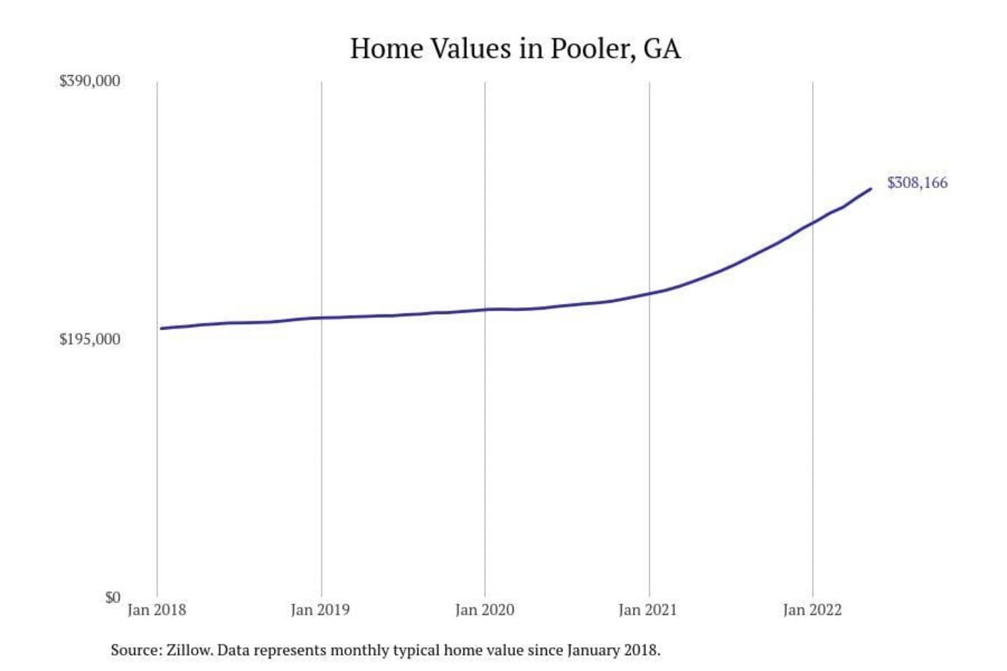 Zillow의 데이터를 활용해 사바나(Savannah), 조지아(GA) 대도시권에서 가장 빠르게 주택 가격이 상승한 도시들을 선정했다. 아래 차트는 2018년 1월부터의 월별 평균 주택 가치를 나타낸다.