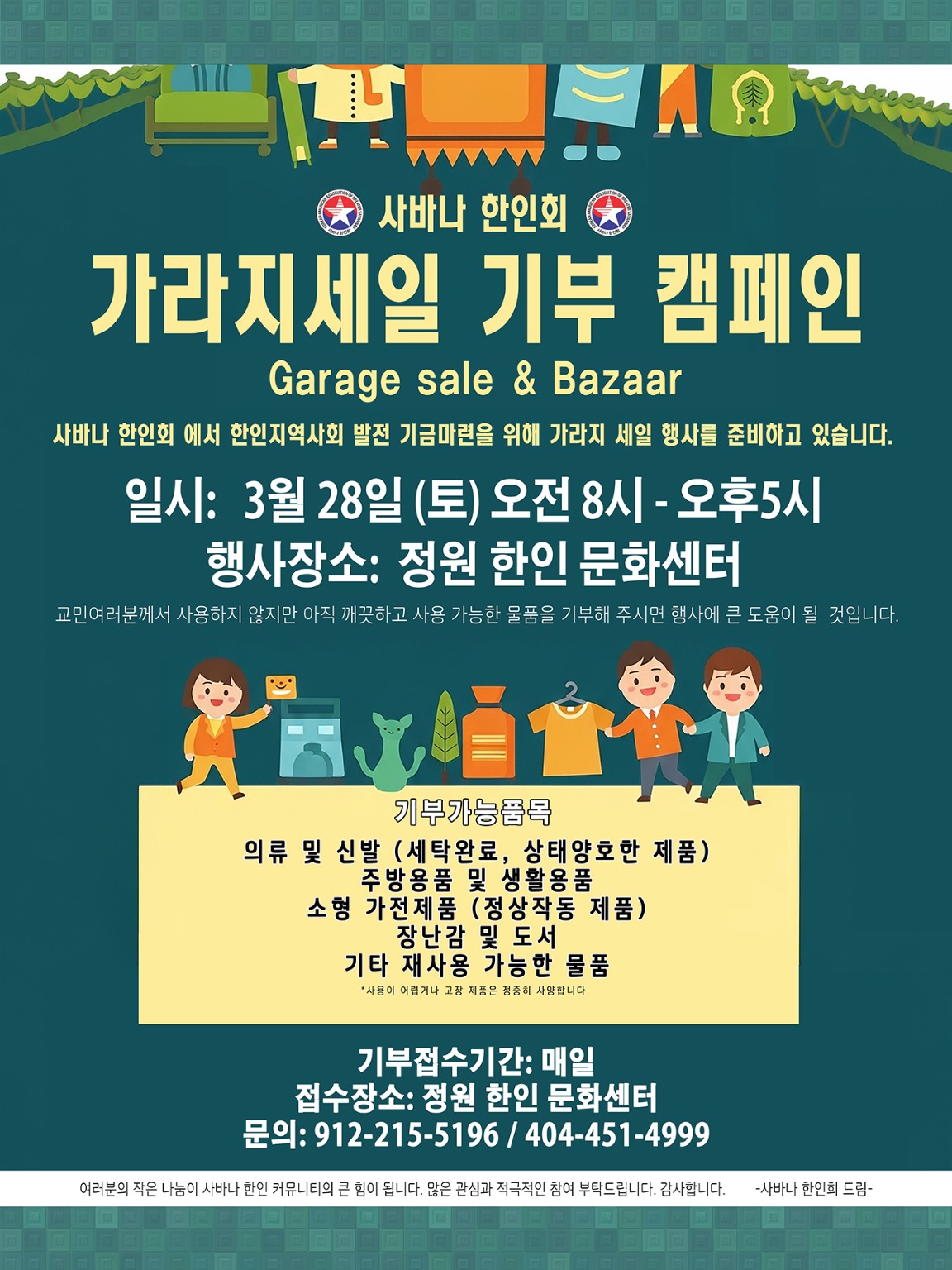 사바나 한인회가 (회장 조다혜) 지역 한인사회의 발전 기금 조성을 위한 ‘가라지세일 & 바자회’를 개최한다. 행사는 3월 28일(토) 오전 8시부터 오후 5시까지 풀러 정원 한인 문화센터에서 진행된다.