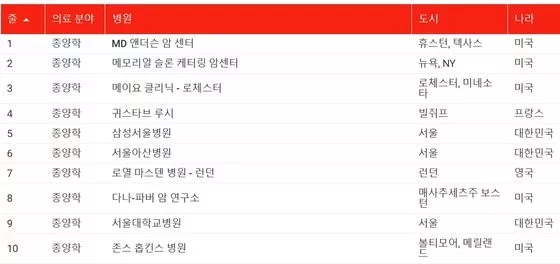 조사 결과에 따르면 종양학 부문에서 삼성서울병원이 5위, 서울아산병원이 6위, 서울대학교병원이 9위에 이름을 올렸다.