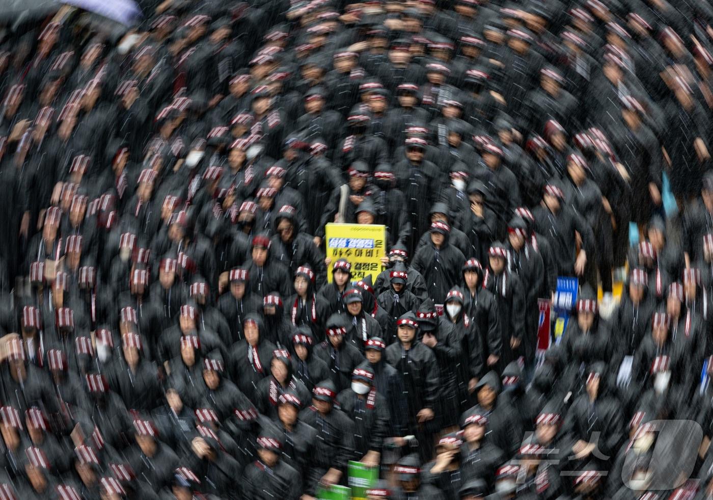 전삼노는 8일 오전 11시 경기 화성시 삼성전자 화성사업장 H1 정문 앞에서 총파업 결의 대회를 열었다. 빗속에서 1시간여 진행된 이번 집회에는 약 3000명의 조합원이 참석했다.