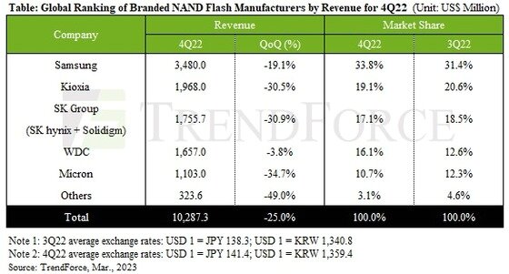 2위인 키옥시아의 매출은 전분기보다 30.5% 감소한 19억6천800만 달러로 집계됐다. 시장점유율은 전분기보다 1.5%p 하락한 19.1%다.