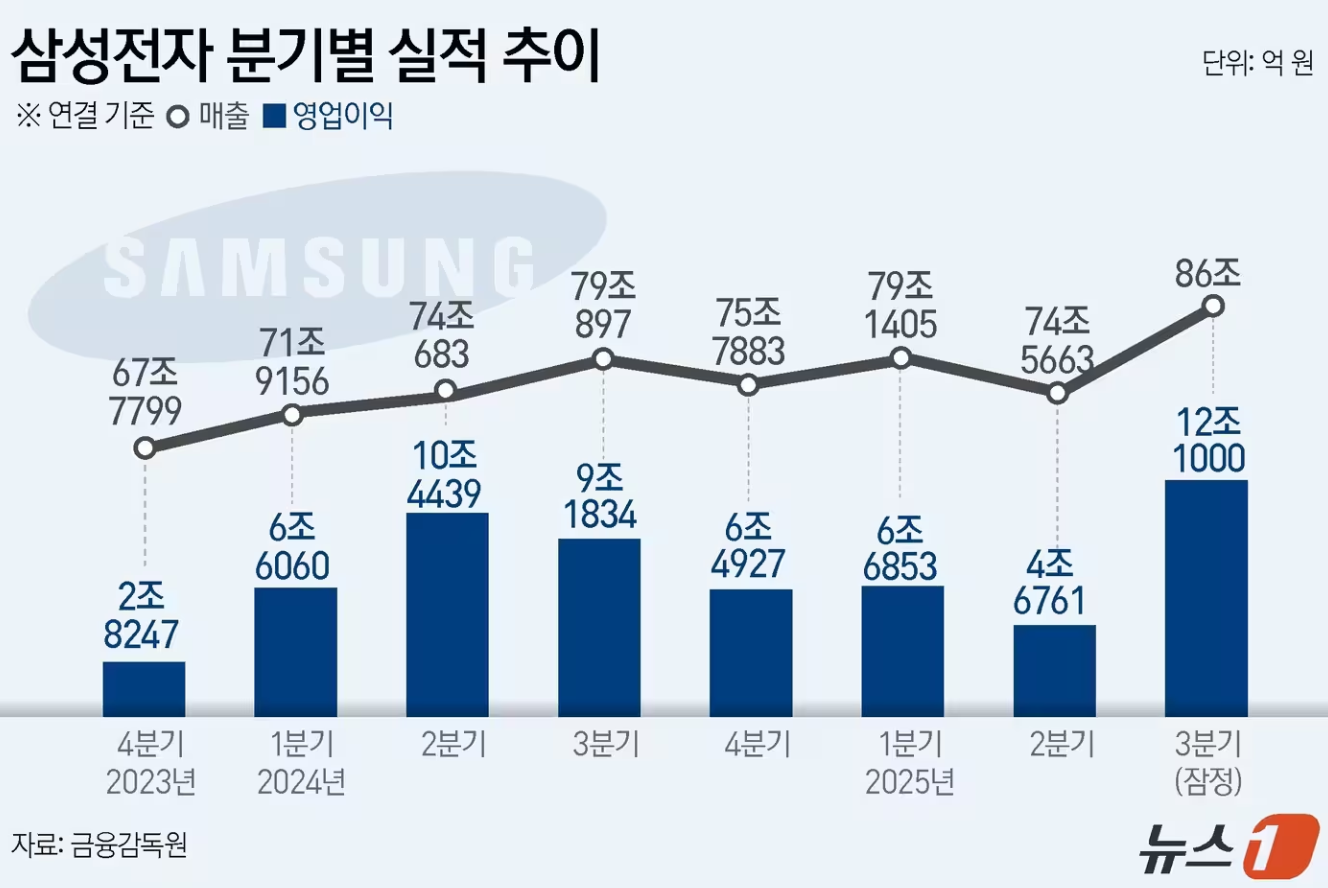 삼성전자(005930)는 올해 3분기 연결기준 영업이익이 전년 동기 대비 31.8% 증가한 12조1000억 원으로 잠정 집계됐다고 14일 공시했다. 이는 2022년 2분기 14조 1000억 원 이후 최고 기록이다.