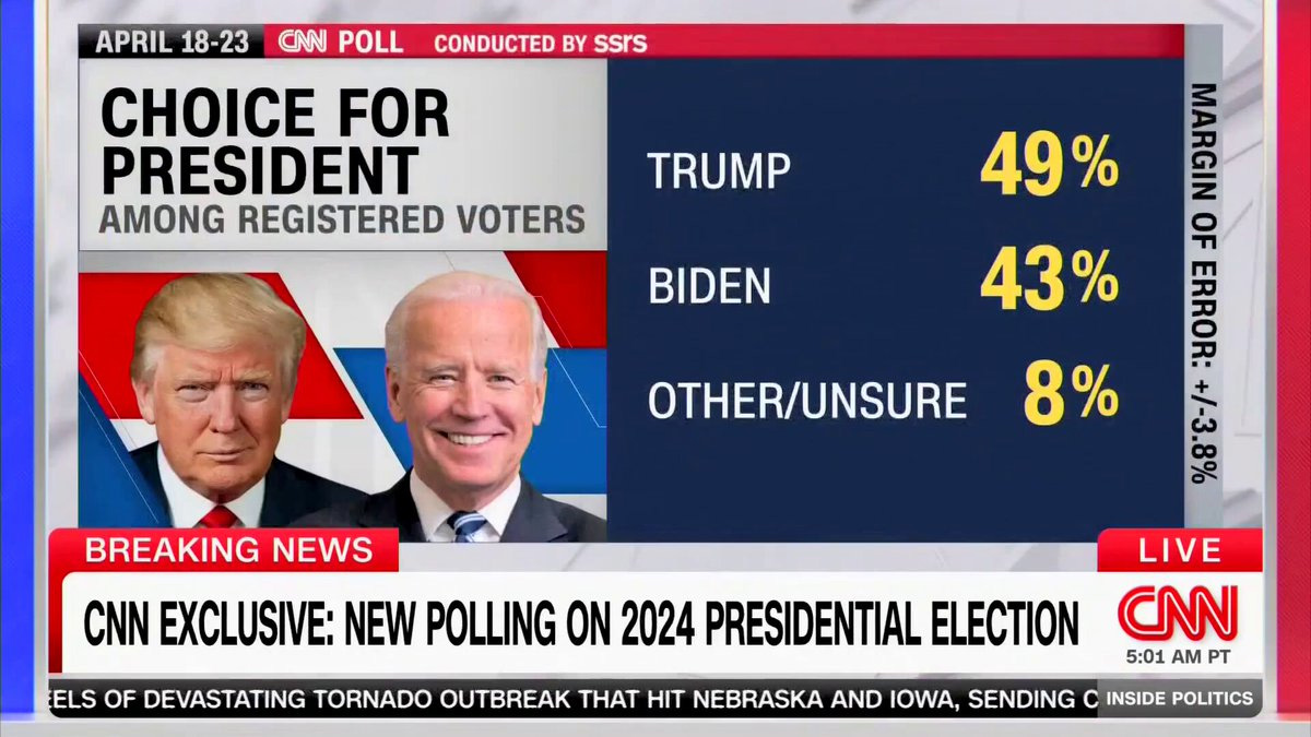 28일(현지시간) CNN 방송이 지난 18일부터 23일까지 등록 유권자들을 대상으로 실시한 여론조사에서 트럼프 전 대통령의 지지율은 49%로 안정적으로 유지되고 있는 것으로 나타났다. 이는 지난 1월 CNN이 실시한 마지막 전국 여론조사와 동일한 수준이다.