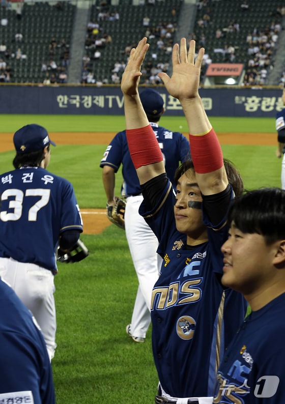 NC 손아섭이 20일 오후 서울 송파구 잠실야구장에서 열린 프로야구 ‘2024 신한 SOL 뱅크 KBO리그’ NC 다이노스와 두산 베어스의 경기 6회초 2사 주자 없는 상황 통산 2505번째 안타를 날려 KBO리그 최다 안타 신기록을 경신한 뒤 팬들을 향해 양손을 들어 인사하고 있다. 2024.6.20/뉴스1 © News1 박정호 기자 |