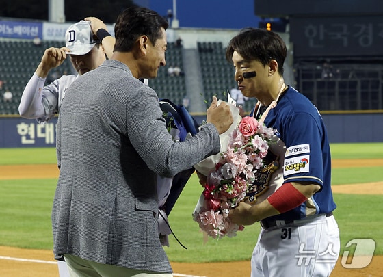 이어 강인권 NC 감독과 박건우, 두산 주장 양석환이 꽃다발과 꽃목걸이를 건넸다.