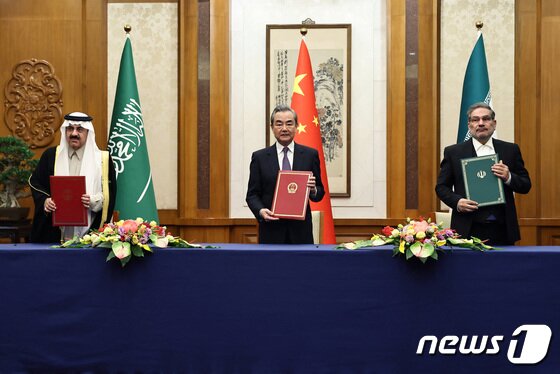 왕이 중국 공산당 중앙정치국 위원이 10일(현지시간) 베이징에서 무사드 빈 무함마드 알아이반 사우디 국가안보보좌관, 알리 샴카니 이란 최고 국가안보위원회 위원장과 양국의 관계 정상화 합의문을 들고 포즈를 취하고 있다. © 로이터=뉴스1 © News1 우동명 기자 |