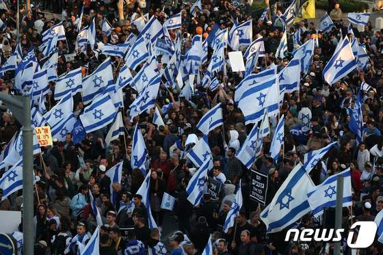 27일(현지시간) 이스라엘 예루살렘 의회 앞에서 사법 개혁에 반대하는 시민들이 대규모 시위를 하고 있다. © AFP=뉴스1 © News1 우동명 기자 |