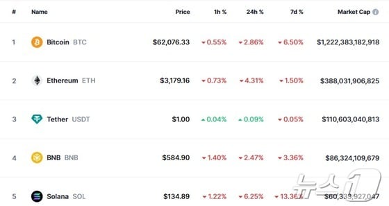 29일 오후 4시 10분 현재 비트코인은 글로벌 코인 시황 중계사이트인 코인마켓캡에서 24시간 전보다 2.86% 하락한 6만2076달러를 기록, 6만2000달러에 턱걸이 하고 있다.