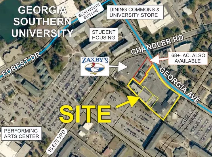 챈들러 로드에 있는 조지아 서던 캠퍼스 바로 건너편에 있는 유니버시티 플라자를 허물고 아파트 공사가 진행 중이다.