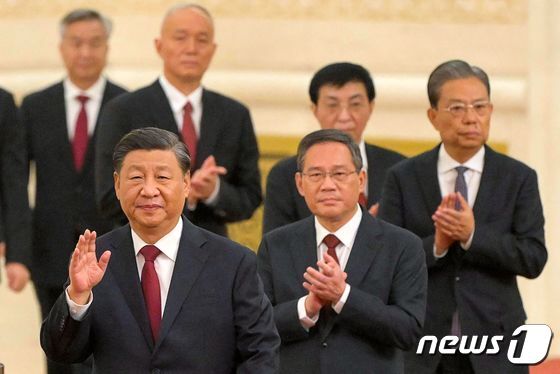 시진핑 중국 국가주석이 2022년 10월 23일 (현지시간) 베이징 인민대회당에서 열린 신임 상무위 기자회견장에 리창, 자오러지, 왕후닝, 차이치, 딩쉐샹, 리시 등 새 최고 지도부와 함께 입장을 하고 있다. © AFP=뉴스1 © News1 우동명 기자 |