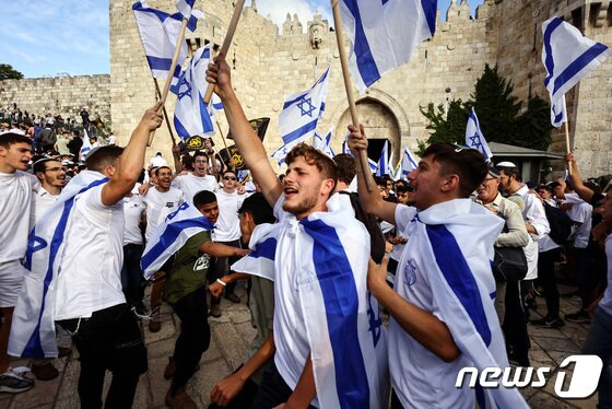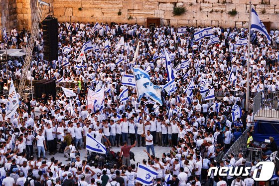 18일(현지시간) 로이터통신과 AFP통신 등에 따르면 이날 예루살렘 구시가지 일대에 수만명의 이스라엘 국우파들이 모여 이스라엘 국기를 흔들며 통곡의 벽까지 행진했다.