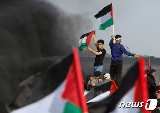 동예루살렘 점령을 기념하는 이스라엘 ‘깃발 행진’이 18일(현지시간) 예루살렘에서 열린 가운데, 이에 항의하는 팔레스타인 주민들이 이스라엘과 가자지구 분리 장벽으로 행진했다. © 로이터=뉴스1 © News1 박재하 기자